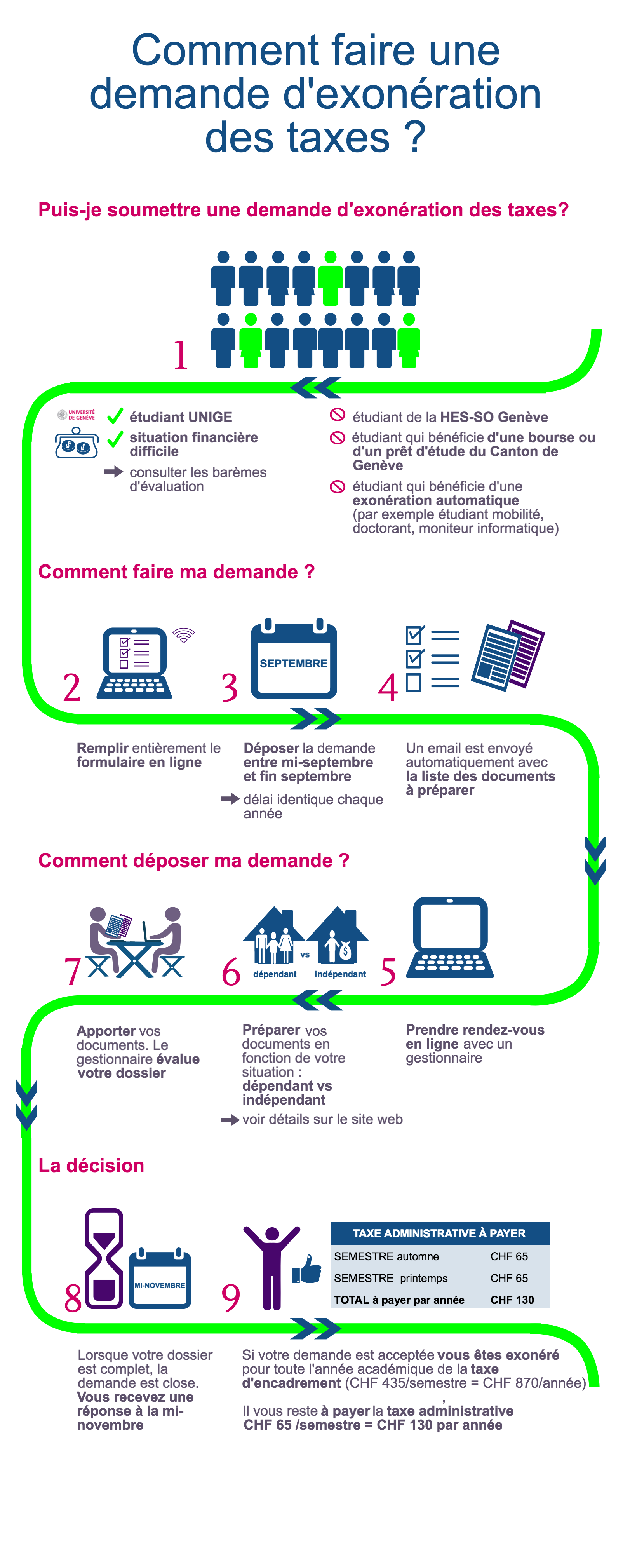 Students enrolled at the University of Geneva are required to pay a CHF 500.- fee each semester. This fee includes a fixed administrative fee of CHF 65.- and a supervision fee of CHF 435.-. If you are experiencing financial hardship, you can apply for an exemption from the supervision fees of CHF 435.